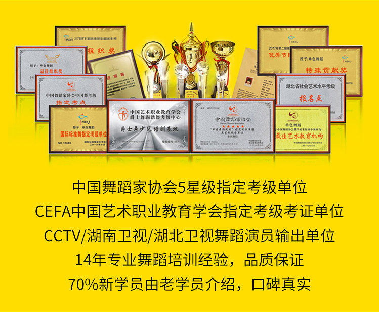 在2019年4月17-18日召開的中國舞蹈家協(xié)會湖北考區(qū)年度表彰大會暨2019年工作會議上,單色舞蹈獲得中國舞蹈家協(xié)會頒發(fā)的五星級教學單位的榮譽證書,而這一榮譽全湖北省只有兩家,單色舞蹈正是其中之一,并且,單色舞蹈已連續(xù)兩屆都被評為“五星級教學單位”。